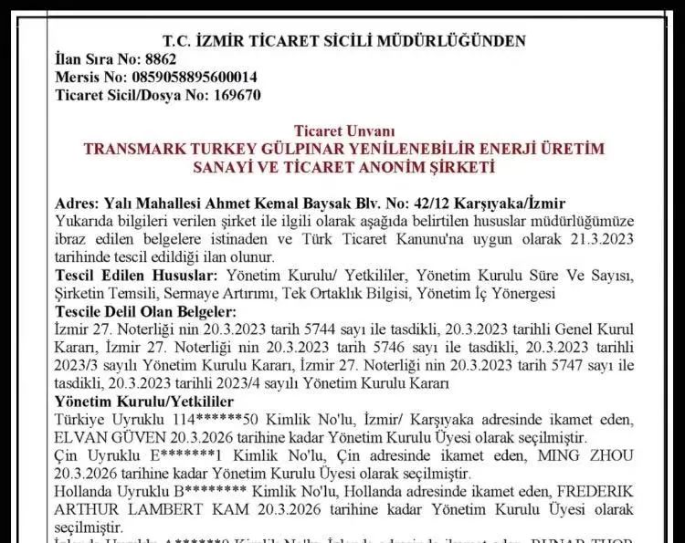 近日,開(kāi)山集團(tuán)股份有限公司的全資公司OME (Eurasia) Pte., Ltd.(以下簡(jiǎn)稱“OME Eurasia”)與Sonsuz Enerji Holing B.V.(以下簡(jiǎn)稱“Sonsuz”)已在伊茲密爾完成Transmark turkey Gulpinar Yenilenebilir Enerji Urtetim Sanayi(以下簡(jiǎn)稱“TTG”)公司的股權(quán)變更手續(xù),完成了OME Eurasia與Sonsuz此前簽署的《TTG公司股權(quán)認(rèn)購(gòu)暨股東協(xié)議》所規(guī)定的交割程序。TTG新股東結(jié)構(gòu)及董事會(huì)成員已在土耳其工商機(jī)構(gòu)進(jìn)行登報(bào)。至此OME Eurasia已成為擁有TTG49%股份的股東,Sonsuz控股51%。
